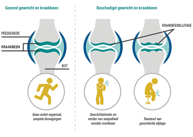 Natuurlijke slijtage van het kraakbeen of slijtage als gevolg van trauma (schokken, slechte houding, intensief sporten) kan op langere termijn leiden tot een gevoel van ongemak en minder soepele en beweeglijke gewrichten.