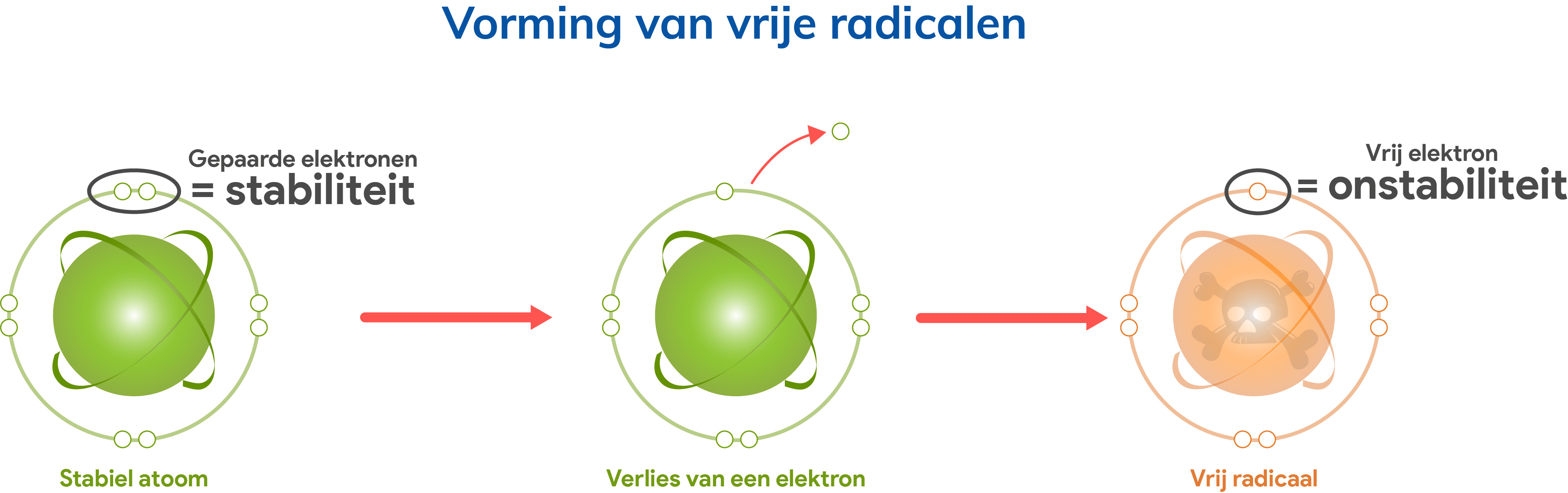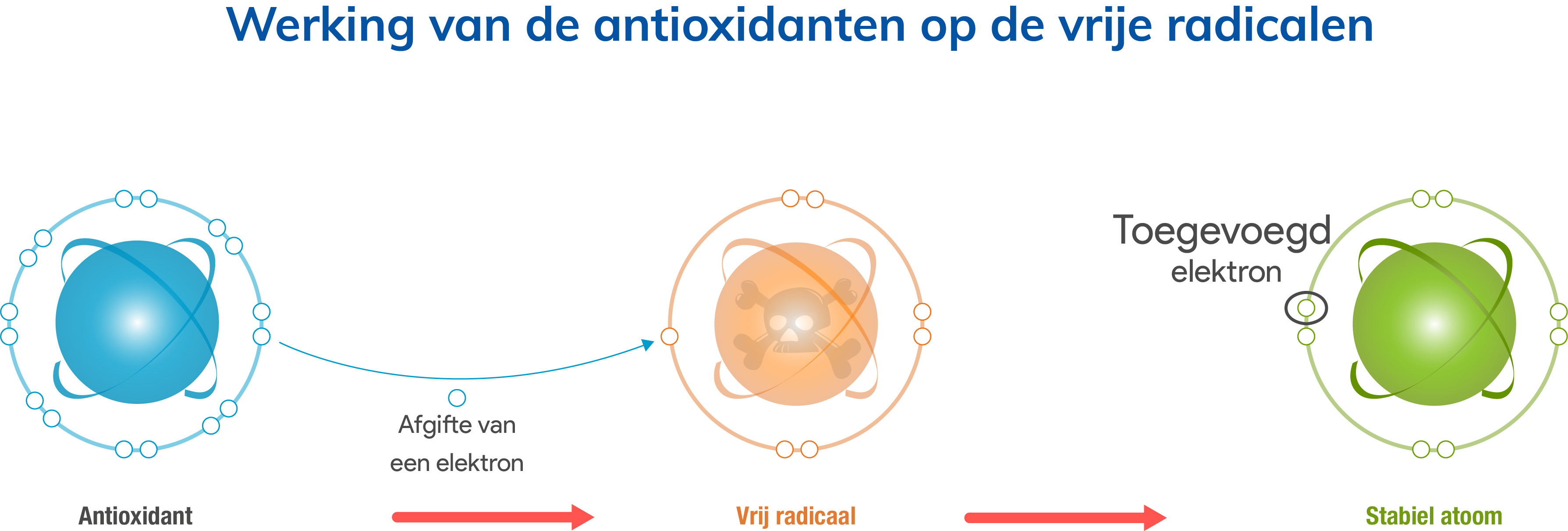 Een antioxidant is in staat om een vrij radicaal te neutraliseren door er eenvoudigweg een elektron aan af te staan. Dit heeft geen gevolgen voor de stabiliteit van de antioxidant zelf, maar herstelt die van het vrije radicaal en biedt het als het ware een tweede leven als stabiel atoom!