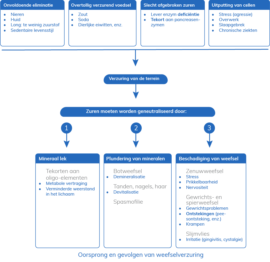 Onze levensstijl en ons voedingspatroon zijn de belangrijkste producenten van zuren. De meeste zuren zijn afkomstig van het metabolisme van koolhydraten (gluciden) en vetzuren. Het katabolisme (afbraak van voedingsstoffen) van bepaalde aminozuren, waaronder zwavelhoudende aminozuren, produceert ook zuren. Het metabolisch product van deze verbindingen kan echter niet worden uitgeademd en wordt door de nieren uitgescheiden of geheel of gedeeltelijk door buffersystemen geneutraliseerd.