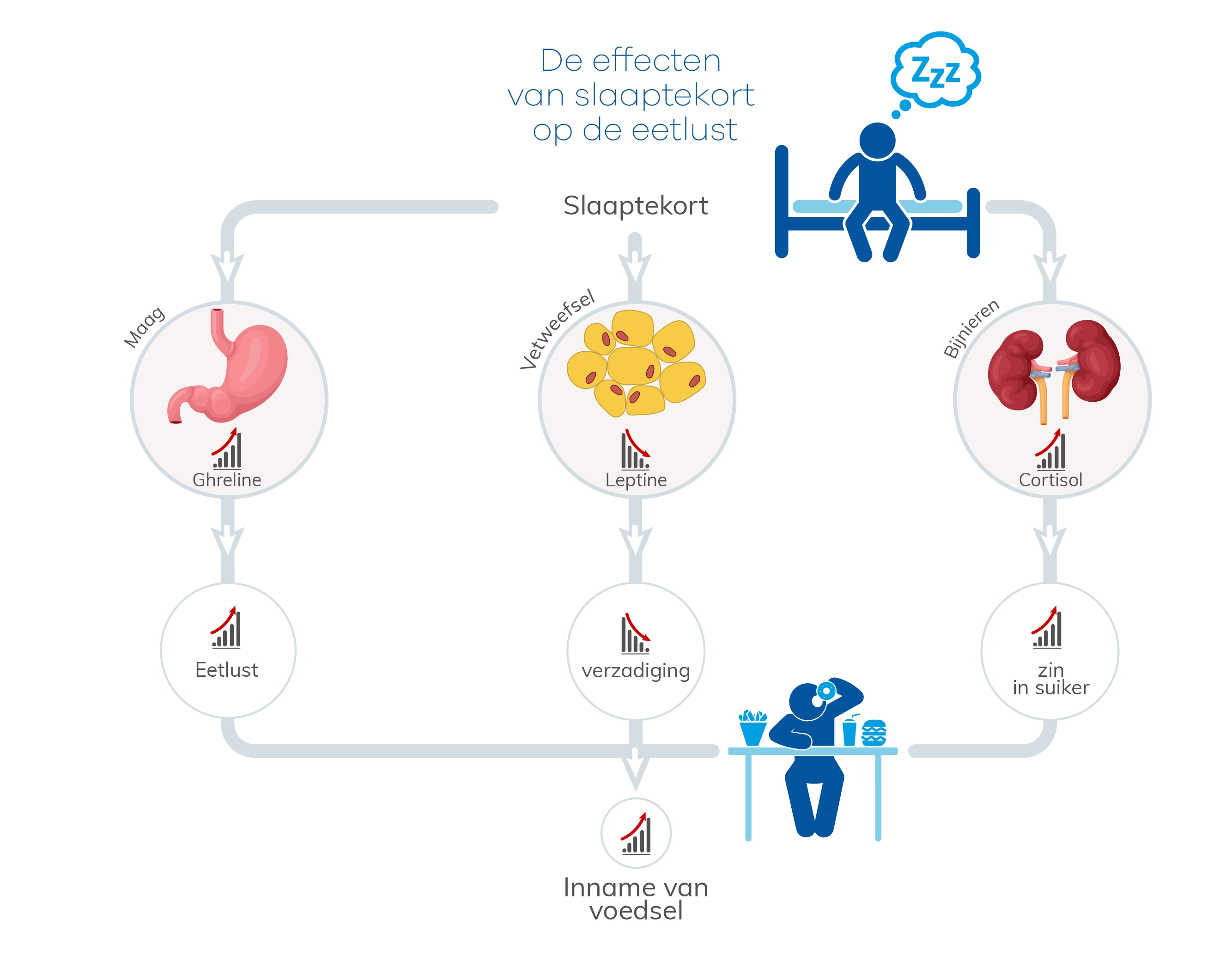 Het honger- en verzadigingsgevoel worden geregeld door ghreline en leptine, twee hormonen die worden geproduceerd volgens het circadiaanse ritme. Een ontoereikende slaaptijd gaat gepaard met een daling van de bloedsuikerspiegel die vervolgens leidt tot een stijging van het ghrelinegehalte. Dit door de maag geproduceerde hormoon heeft een zogenaamde orexigene werking. Het is namelijk in staat de eetlust op te wekken en het lichaam aan te zetten tot het eten van zeer calorierijke voedingsmiddelen. Dit zijn niet altijd de beste voedingsbronnen, in tegenstelling tot bijvoorbeeld eiwitten die opzij worden geschoven voor vette en zoute voedingsmiddelen! Tegelijkertijd daalt het leptinegehalte, terwijl dit door de vetcellen geproduceerde hormoon het gevoel van verzadiging regelt.