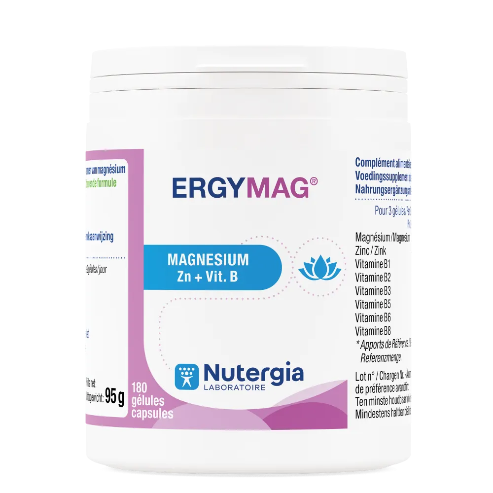 ERGYMAG® est riche en 4 formes de magnésium, vitamines B2, B3, B5 et B6 qui contribuent à la réduction de la fatigue et à un métabolisme énergétique normal. Le magnésium participe aussi au maintien du bon fonctionnement du système musculaire.