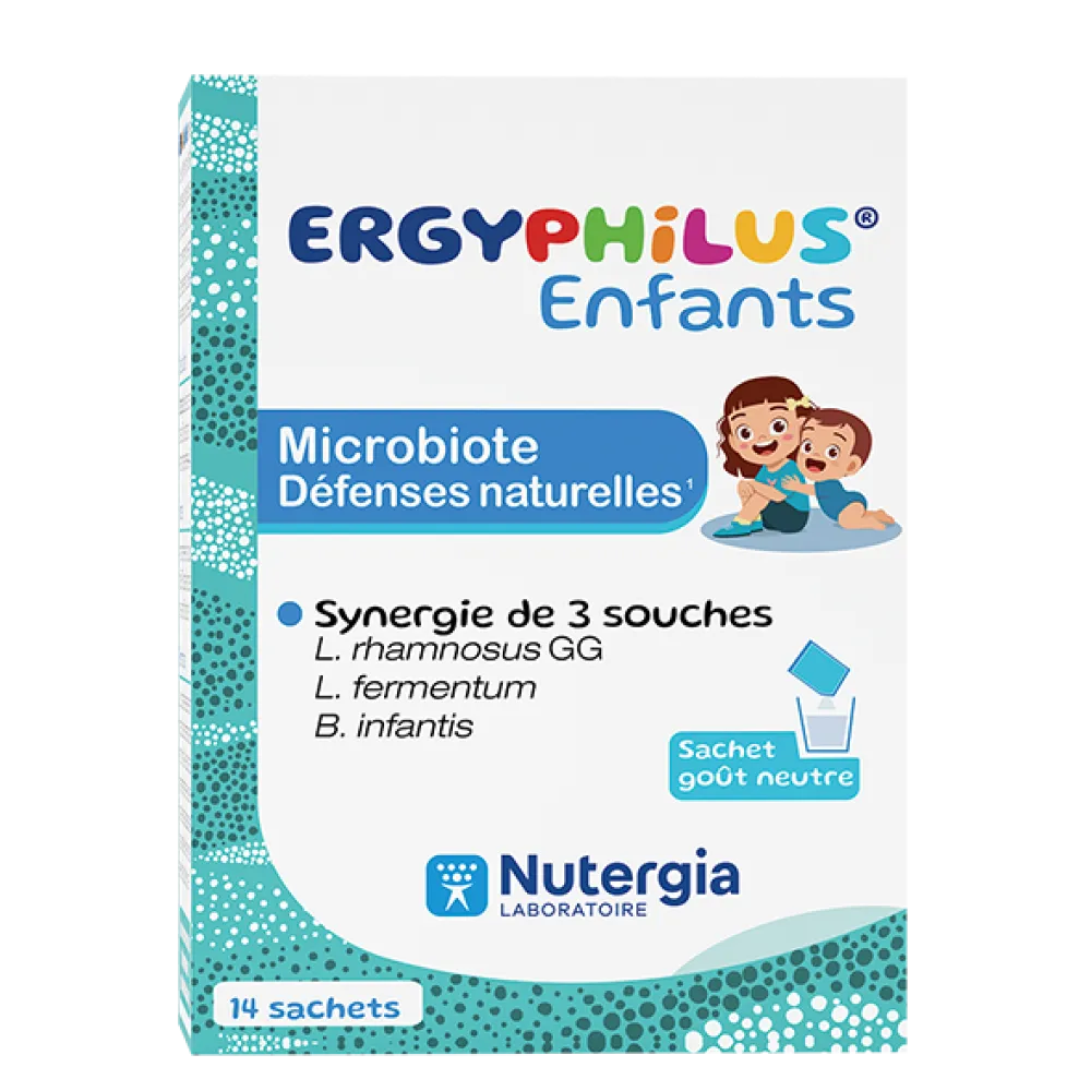 ERGYPHILUS® Enfants pourra être conseillé pour contribuer à développer l’équilibre de la flore intestinale des enfants et pour soutenir leurs défenses naturelles grâce à vitamine D3.