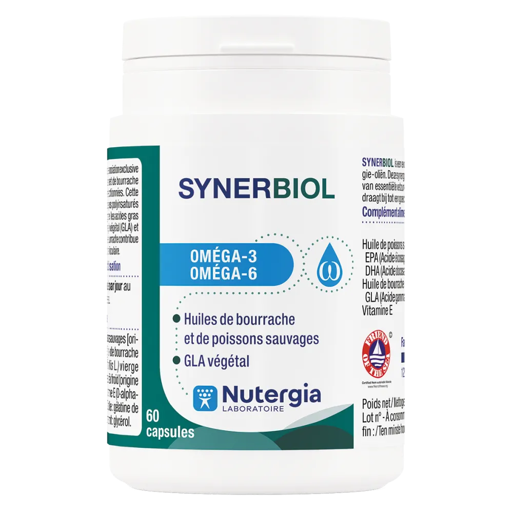 SYNERBIOL est une association exclusive d’huile végétale de bourrache et d’huiles de poissons sauvages et obtenues sans estérification. Il apporte en quantité équilibrée l’ensemble des acides gras essentiels à l’organisme, à la fois des oméga-3 marins et des oméga-6 végétaux.