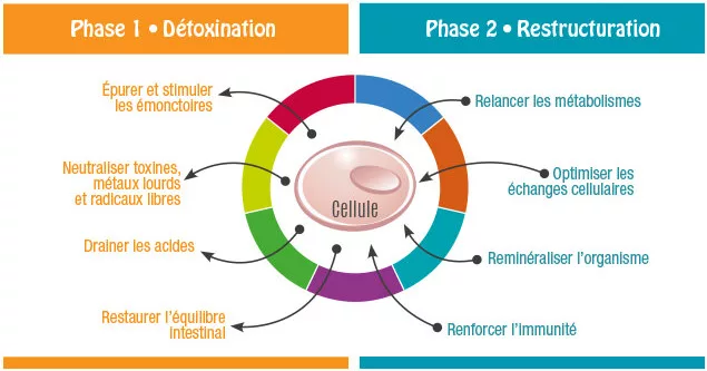 La prise en charge par la Nutrition Cellulaire Active® comprend deux phases successives. Parce qu’il est inutile d’apporter des nutriments déficitaires sans avoir « nettoyé » la cellule de ses excès, cette approche commence par une première phase de détoxination d’au moins un mois. Celle-ci favorise l’élimination des toxines qui peuvent surcharger la cellule et soutenir ainsi son capital fonctionnel.